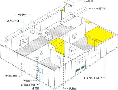 千級潔凈室之定義為將一定空間范圍內(nèi)之空氣中的微塵粒子、有害空氣、細菌等之污染物排除,并將室內(nèi)之溫濕度、潔凈度、室內(nèi)壓力、氣流速度與氣流分布、噪音震動及照明、靜電控制在某一需求范圍內(nèi),而所給于特別設(shè)計之密閉空間。